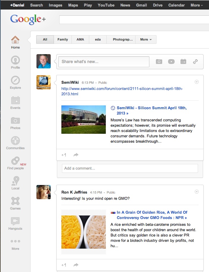 From a user perspective I find that more of my high-tech, geeky, Google-loving friends and professionals are attracted to Google+. My personal friends and family tend to be using Facebook. There you have it, both social media channels will continue to grow, innovate, imitate, and on occasion innovate.